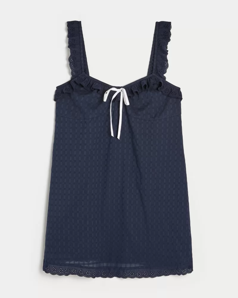 A pretty trapeze mini-dress with ruffled lace trim along the neckline, straps and hem. Center tie detail. Imported.