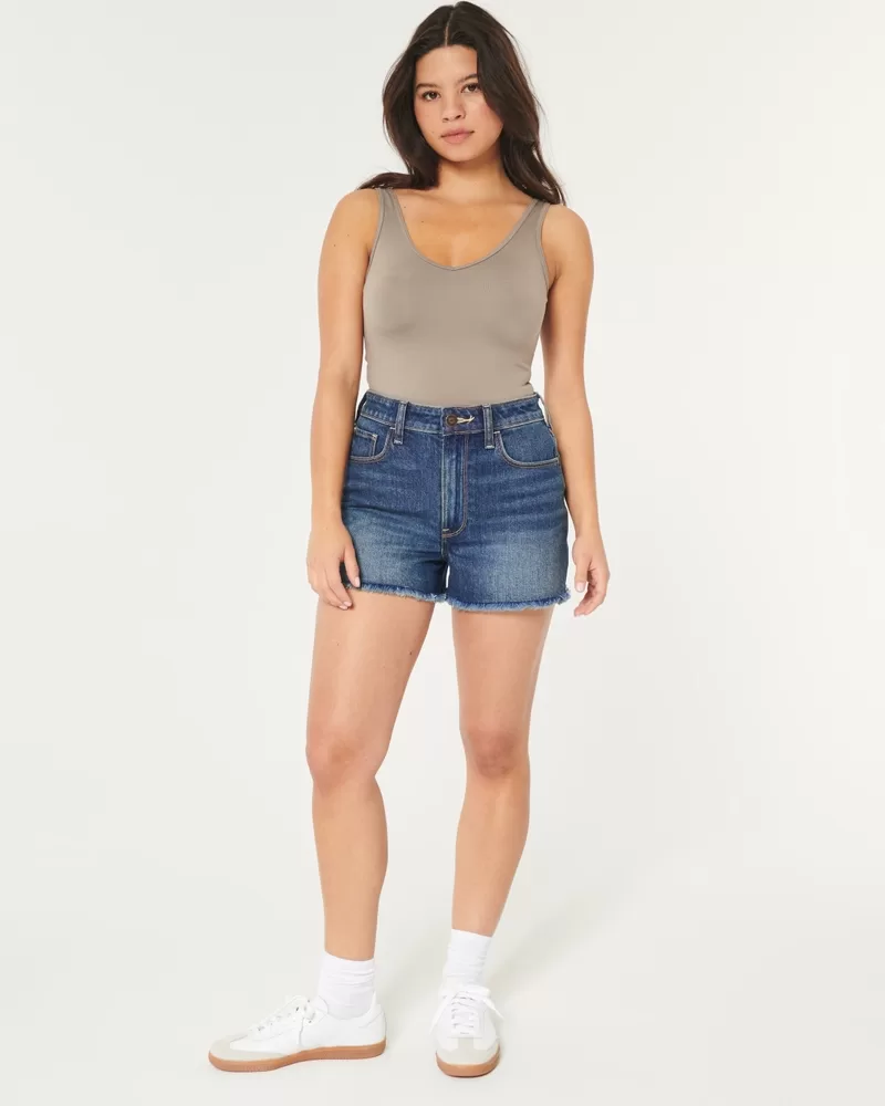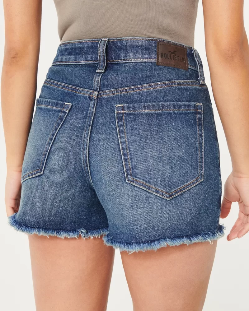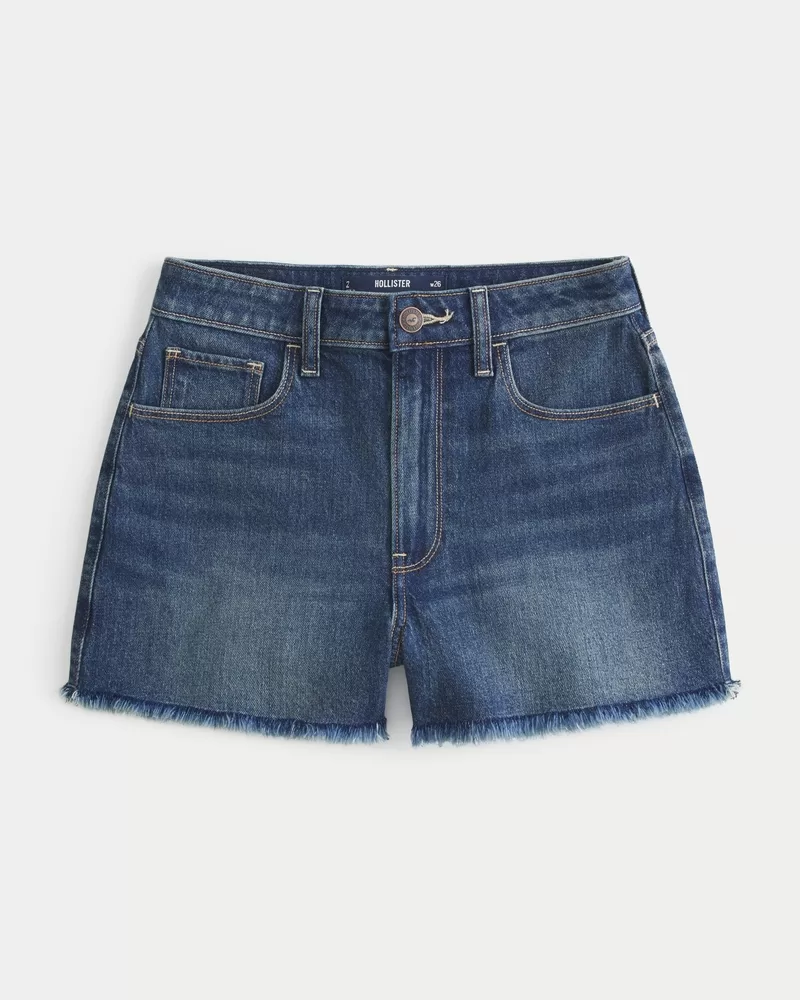 Cute and comfy denim shorts in a dark wash, designed with an ultra high-rise waist and relaxed fit. Frayed hems, fading and whiskering.