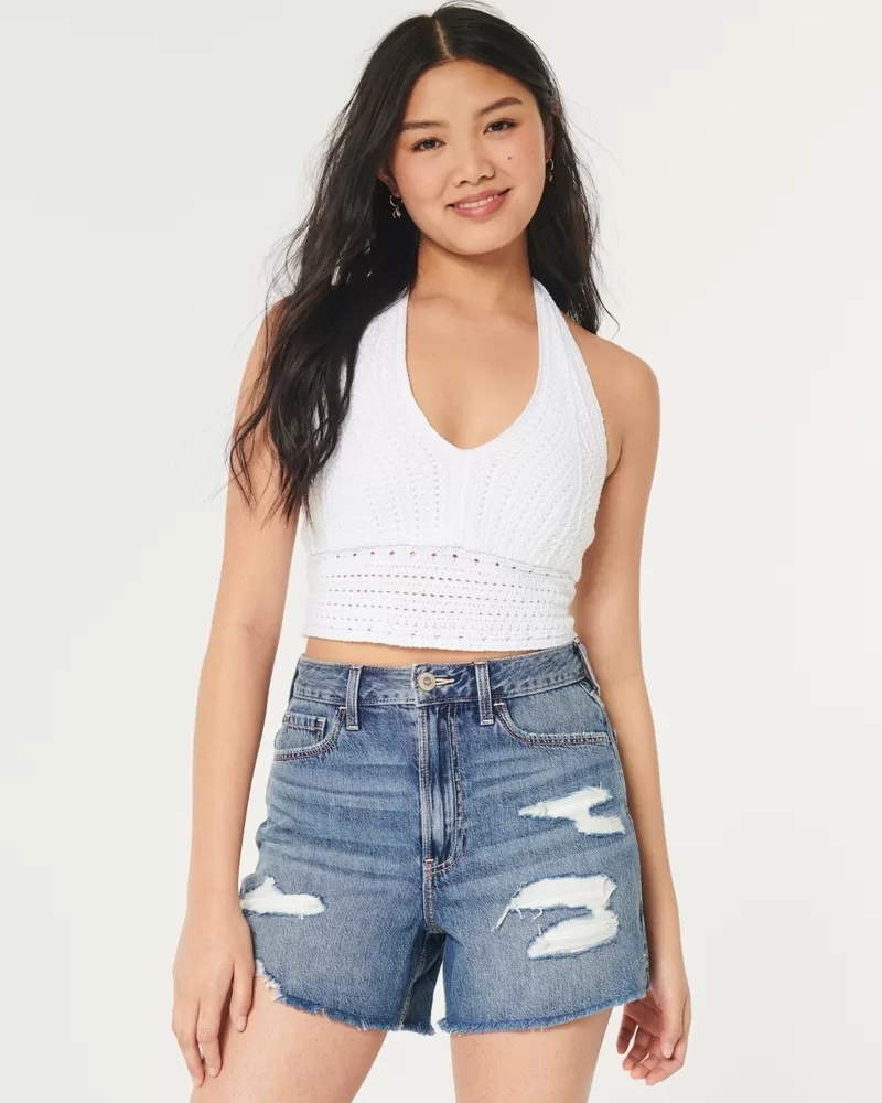 Cute and comfy denim shorts in a medium wash, designed with an ultra high-rise waist. Ripped detailing, fading and whiskering, frayed hems, 5″ inseam. Imported.