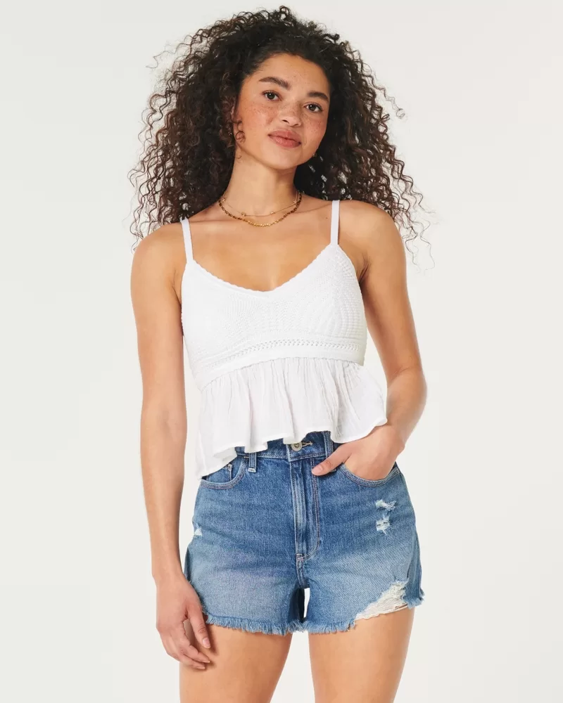 Cute and comfy denim mom shorts in a medium wash with ripped detailing, fading and whiskering. Relaxed fit, ultra high-rise waist, relaxed fit, frayed hems. Imported.
