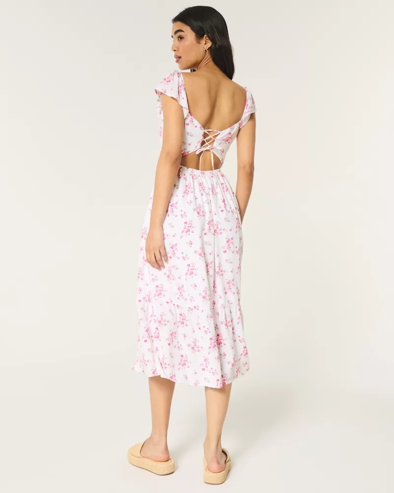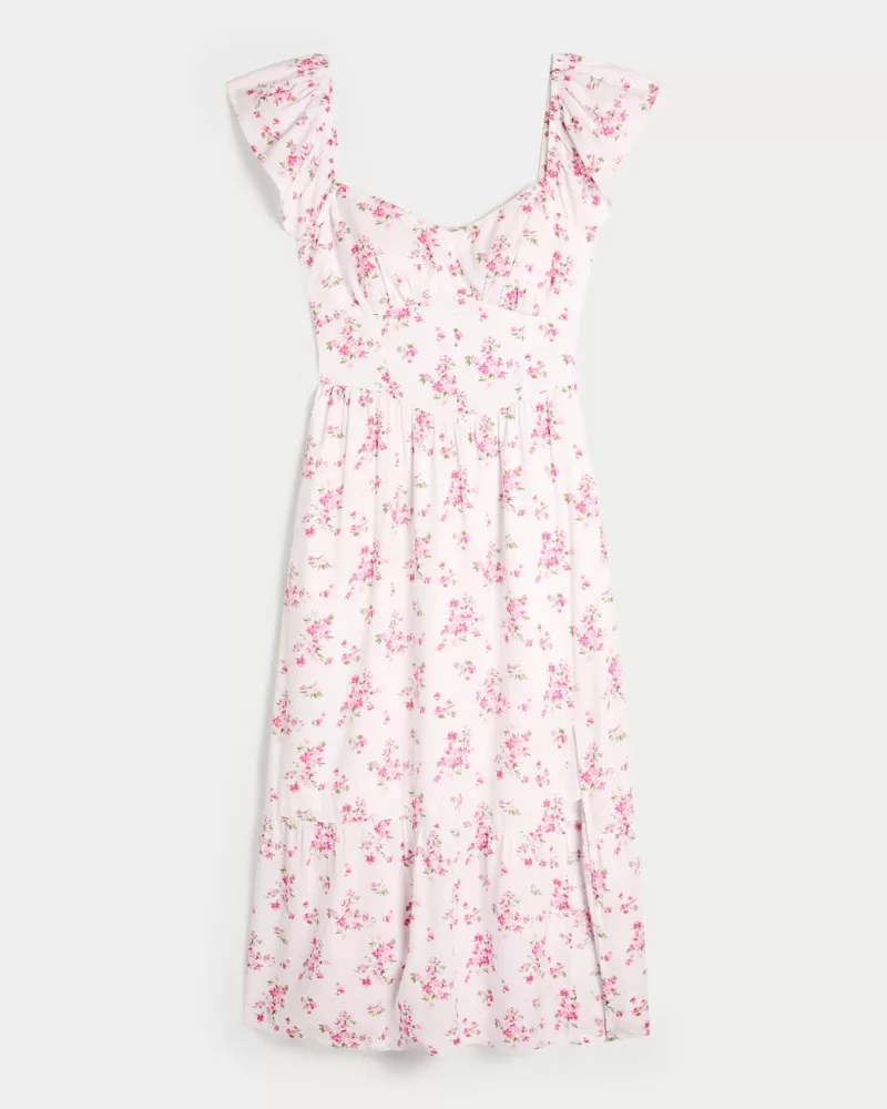 A flowy and super soft midi-length dress with short sleeves and a v-waist detail. Flutter sleeves, split hem detail.
