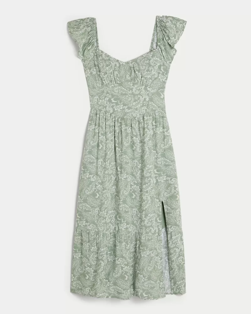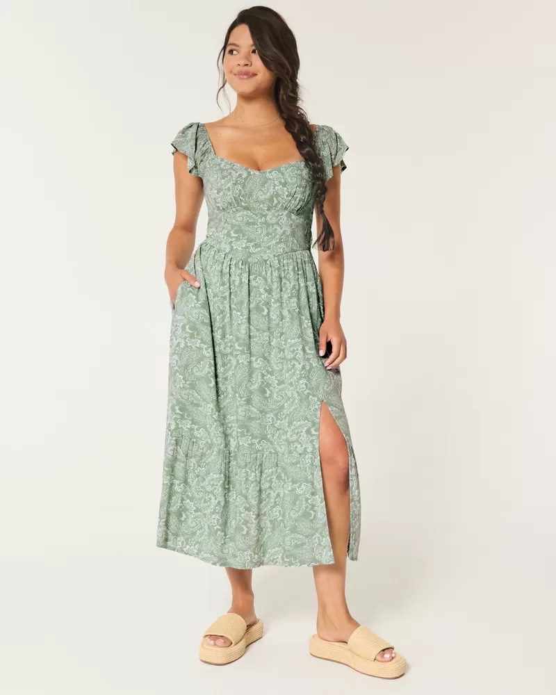 A flowy and super soft midi-length dress with short sleeves and a v-waist detail. Flutter sleeves, split hem detail. Imported.