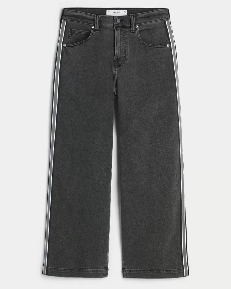 Ultra-comfortable denim jeans in washed black, designed with a super baggy leg and taping at the sides. Imported.